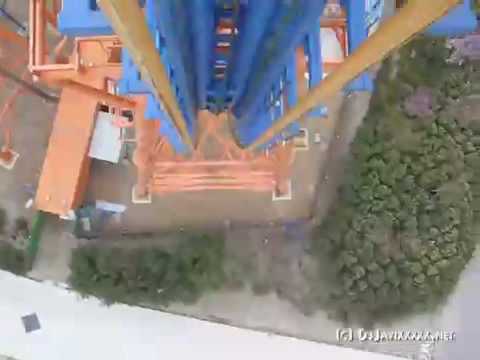 Stunt Fall / Parque Warner Madrid: pues en el 2001 llegó la ultima modificación y esta ya es algo mas importante, cambiaron totalmente la inclinación de los brazos hasta ponerlos en vertical y el recorrido, si bien tiene los mismos elementos, estos son ligeramente diferentes y mas grandes. De esta solo hay 4 por el mundo y debo reconocer que si bien parece más impresionante desde abajo que una vez subido, la primera caída si que hace que se te pongan mariposillas en el estomago.