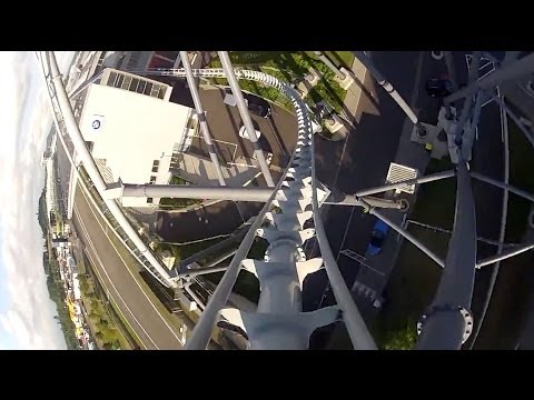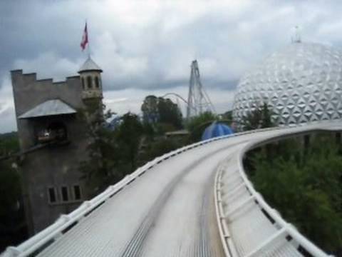 la estacion esta en horizontal donde te subes, luego el tren va marcha atras "trepando" por los postes hasta llegar arriba. ahi, sin avisar te sueltan pasas otra vez por la estacion a 100 kilometros por hora y empieza el meneo hasta que llegas al otro poste. un cable te recoge y te sube otra vez para soltarte sin avisar y volver ha hacer el recorrido al revés, vuelves a pasar por la estación esta vez al revés y subes por el primer poste donde un cable te engancha y te lleva ya despacio hasta la estación para que bajes.