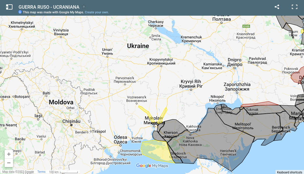 Comenté hace un par de semanas, los primeros días de la invasión, que tengo una amiga ucraniana residente aquí en BCN, con su madre en la ciudad de Mykolaiv, cuya situación podéis ver en este mapa de la gente de Descifrando la guerra: