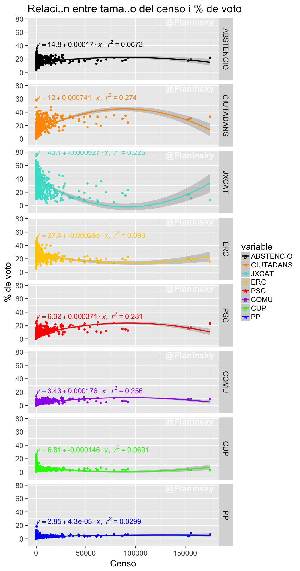 Si sacamos Barcelona de la ecuación, los resultados son algo más claros. En las zonas mas rurales hay mas independentismo pero a partir de un tamaño medio la proporción de votos se guía por otros parámetros (por eso la regresion da esa curva chunga -con una líneal la R2 es demasiado baja-)