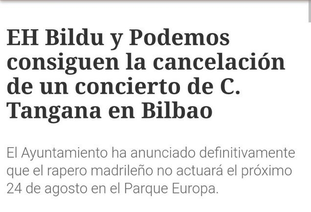 ¿Adónde vas? Manzanas traigo. Me pregunto si los de Bildu y UP se presentaron en la puerta del camerino para no dejar salir a Tangana. Por cierto, luego el artista hizo creo que dos conciertos gratis en el mismo Bilbao. No fue nadie de Bildu o UP a apagarle el micro o sacarlo del escenario. Y lo de "escándalo ninguno" te lo has sacado de la brenca, que se lió una buena y tú mismo dices que Pablo Iglesias salió a defender la actuación y no cancelación. ¿Por qué sería, si "escándalo ninguno"?