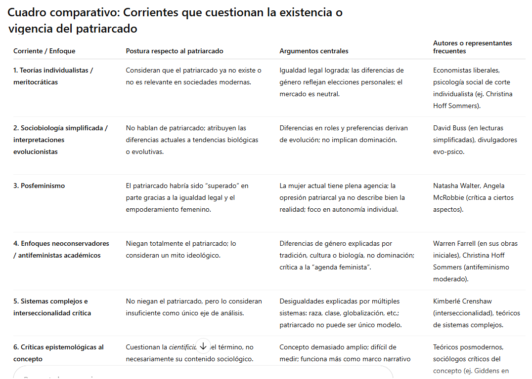 IA: No, el patriarcado no promueve explícitamente “matar a la mujer” como si fuera una norma escrita o un mandato directo. Lo que sí ocurre es que el patriarcado, entendido como un sistema social que coloca a los hombres en una posición de poder sobre las mujeres, genera condiciones estructurales que pueden favorecer la violencia contra ellas